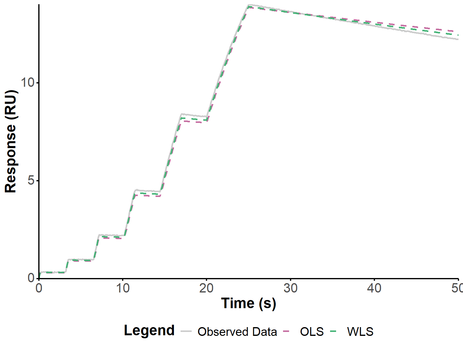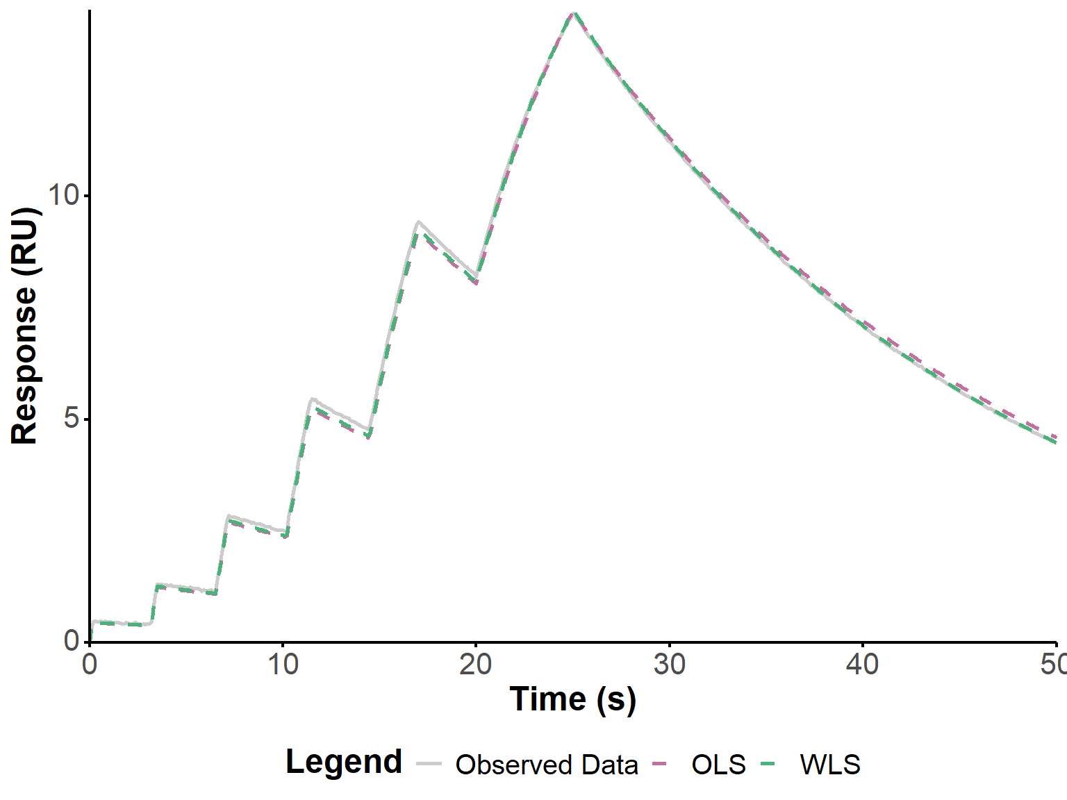 Table 2 presents the kinetic parameters obtained from the initial estimation, OLS optimization, and WLS optimization, along with their comparison to the true parameters used for data simulation. The table also includes the percentage of the true parameters represented by the initial estimates and the optimized estimates for both approaches. WLS allows the closest estimation of the true values; in particular the improvement of the association constant is significant. The \(R_{\text{max}}\) value is also closer to reality.