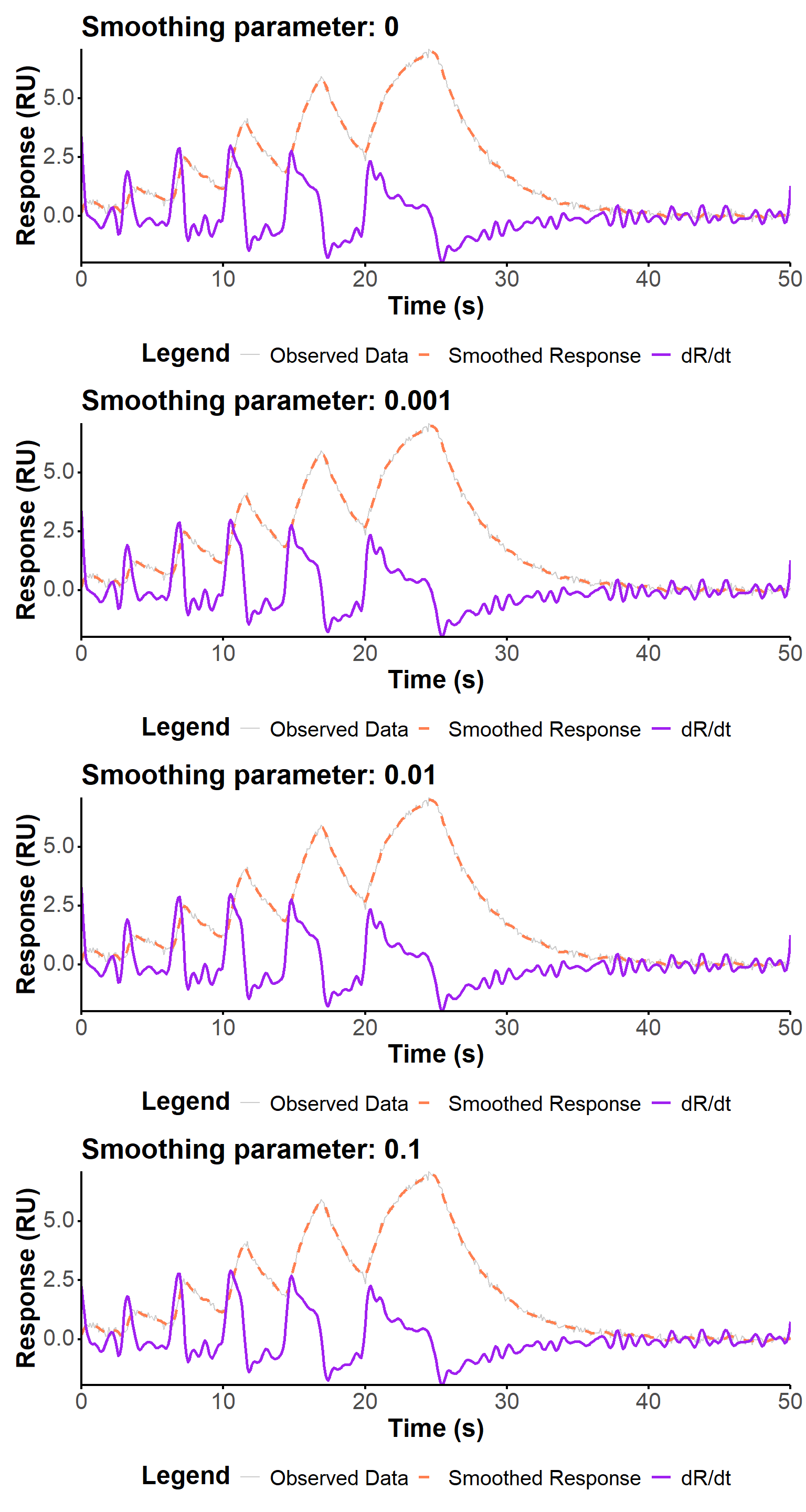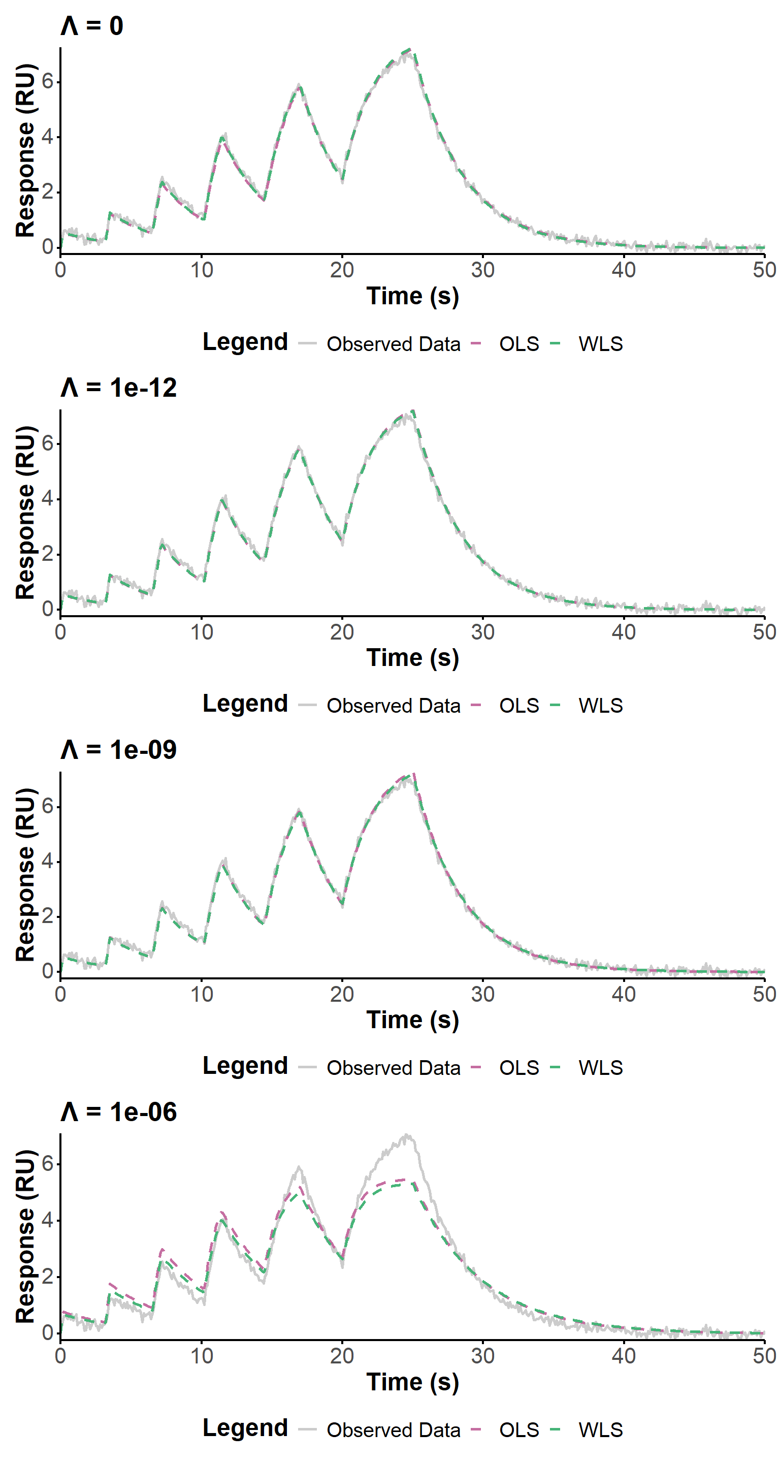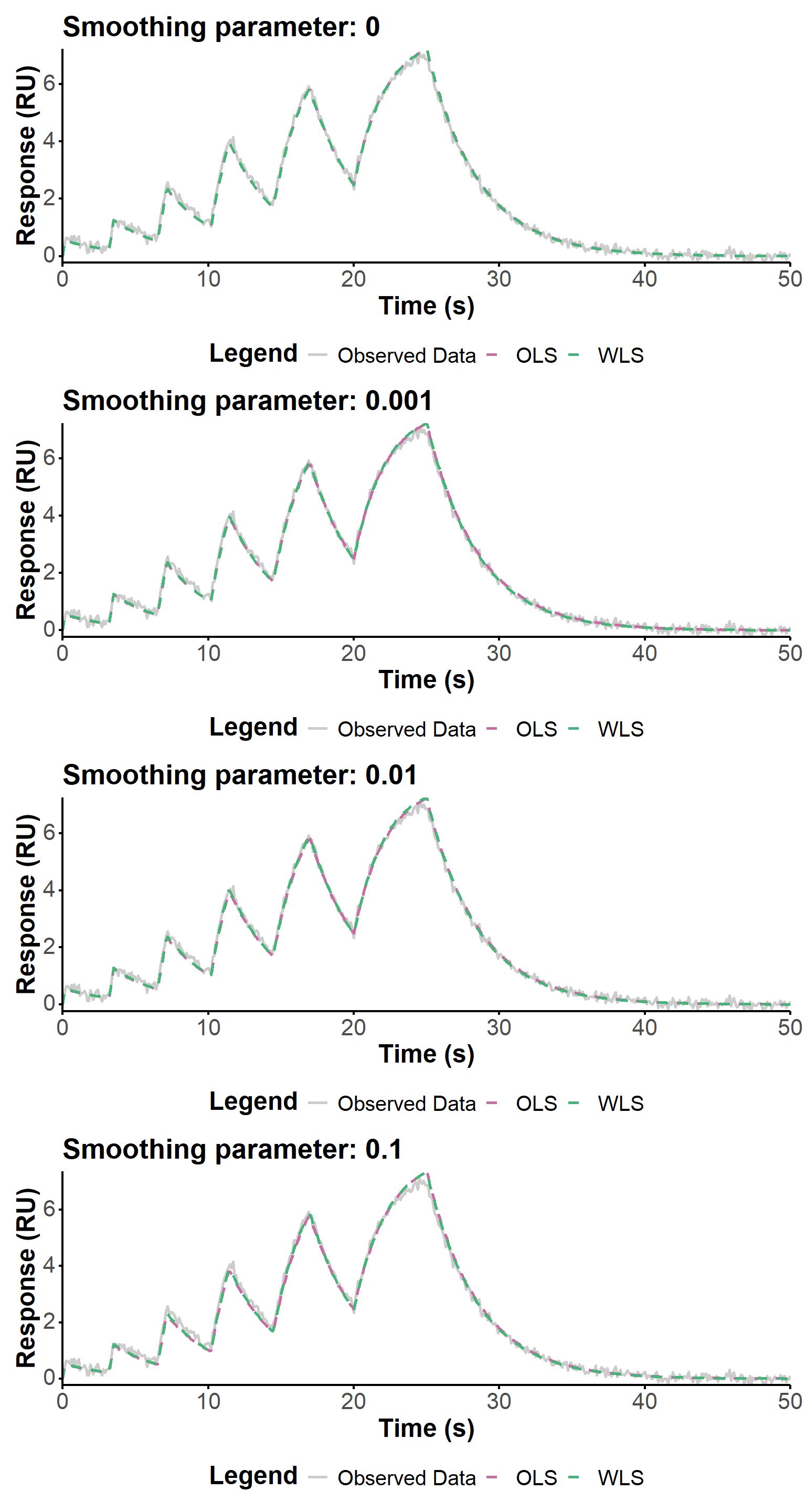 The fit quality is visually similar (Figure 11) for the different smoothing parameters, and the estimated values are generally very close. The largest smoothing value (0.1) seems to produce a slightly worse fit, and a slightly worse estimation of the kinetic parameters, but the differences are not very significant. The WLS approach seems to be more robust to estimate the association constant, which in any case remains relatively far from the true value.