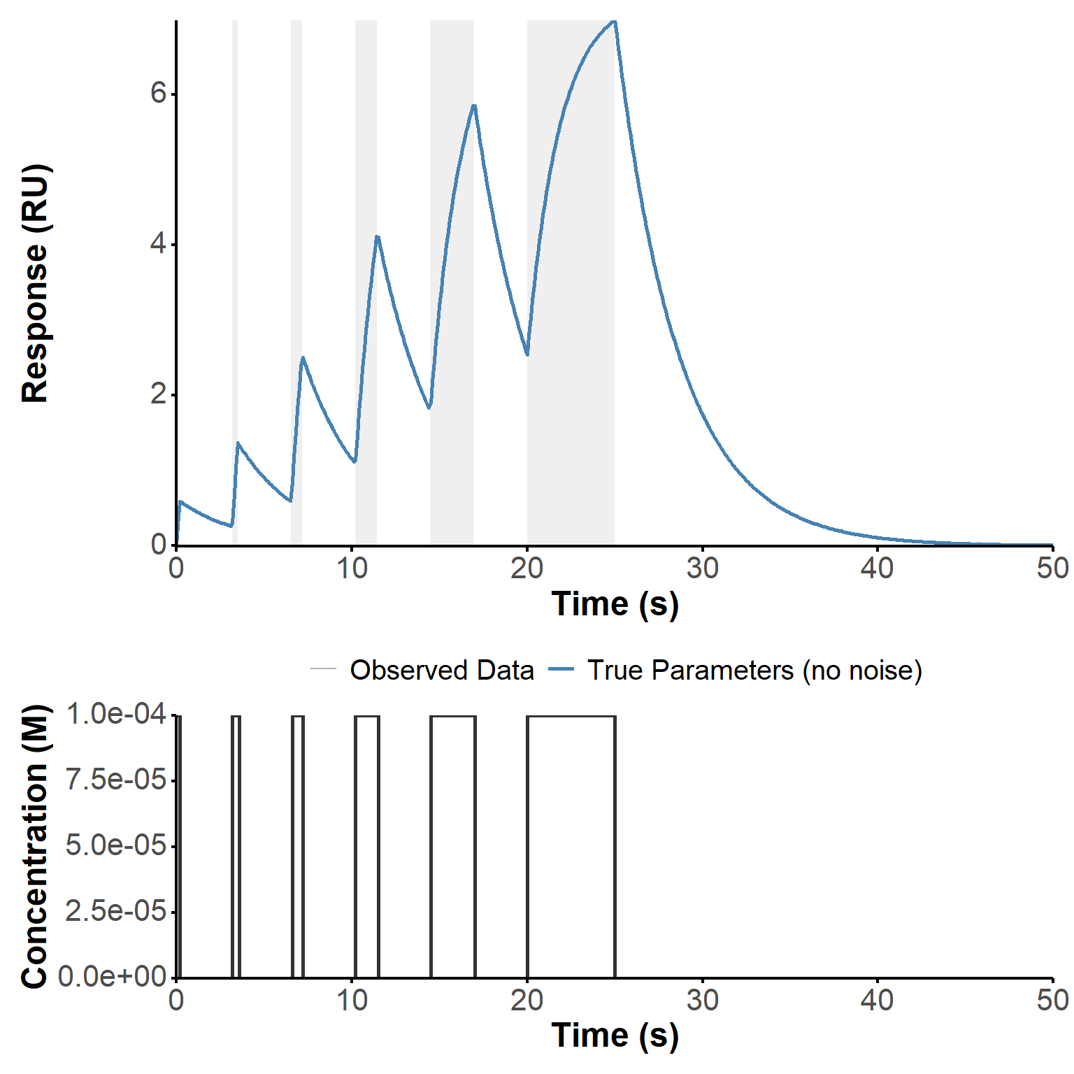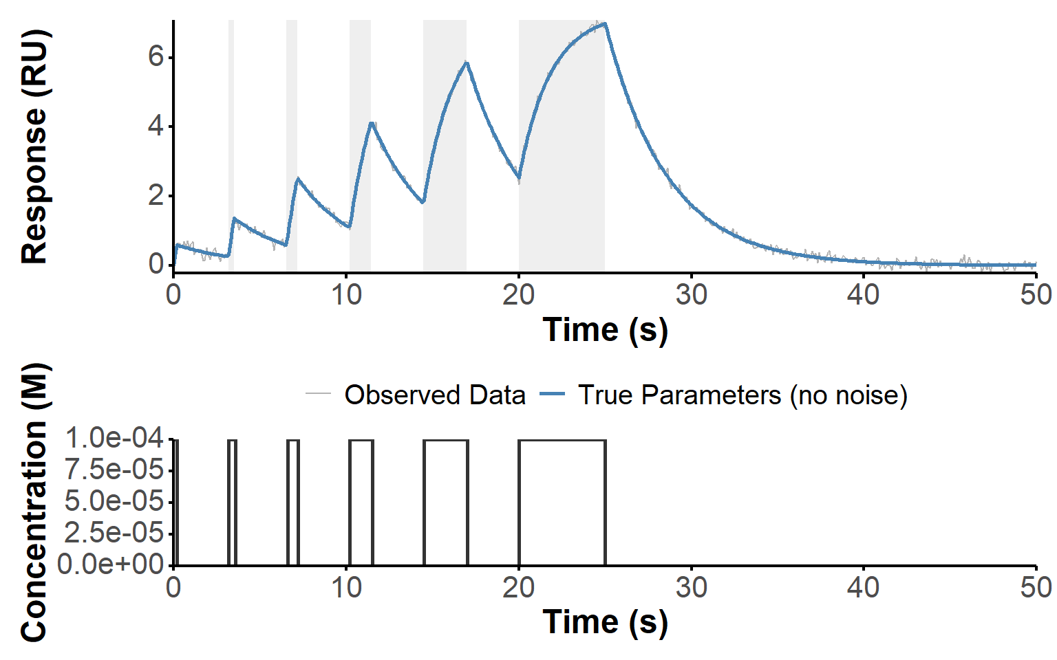 )Fake experimental data was generated by simulating the response of a Langmuir binding model to a waveRAPID concentration profile. As a reminder, the concentration profile consists of multiple pulses of same concentration of analyte but increasing durations. The response is generated by solving the corresponding ordinary differential equation (ODE) with added noise to mimic experimental conditions.
