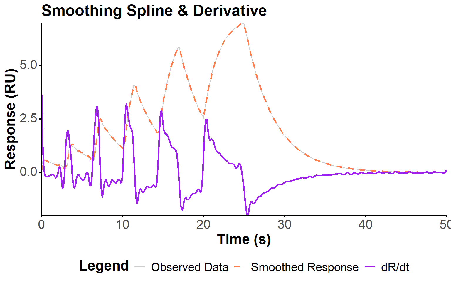 Here, we use a smoothing spline to fit the observed response_data and then compute the derivative of the smoothed response dR_dt (Figure 2).
