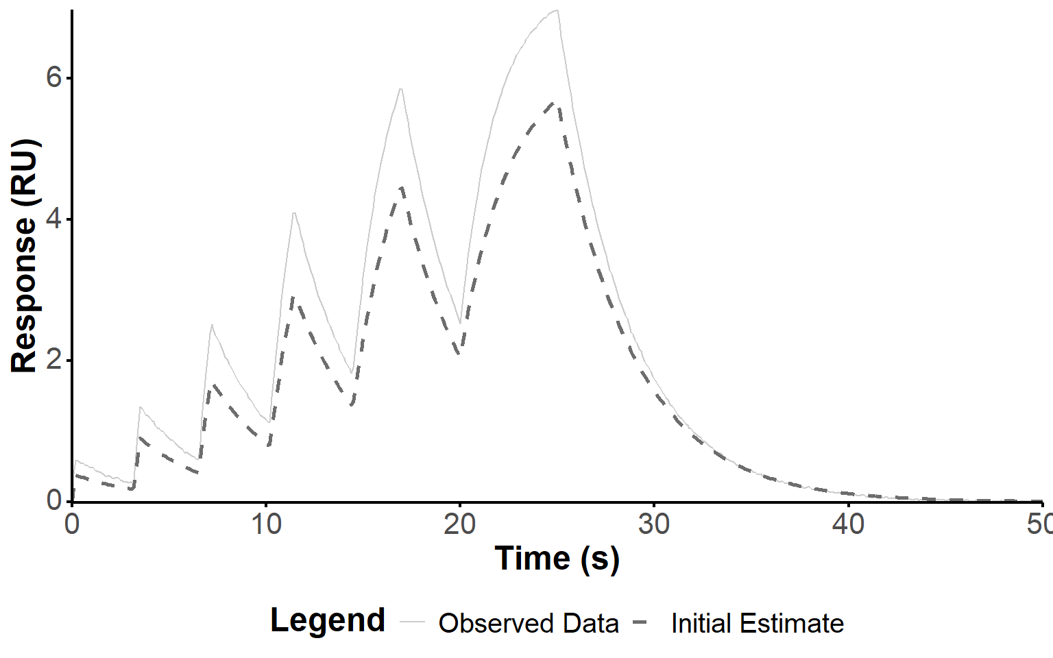 Note that R was artifically decreased to 80% of its estimated value, as more accurate estimations produced issues with the optimization step, below. Hence, the corresponding simulation of the response using the ODE model does not match the experimental response intensity (Figure 3). However, the kinetic parameters are close to the true parameters, and the shape of the response is reasonably well captured, which is sufficient for the optimization step.