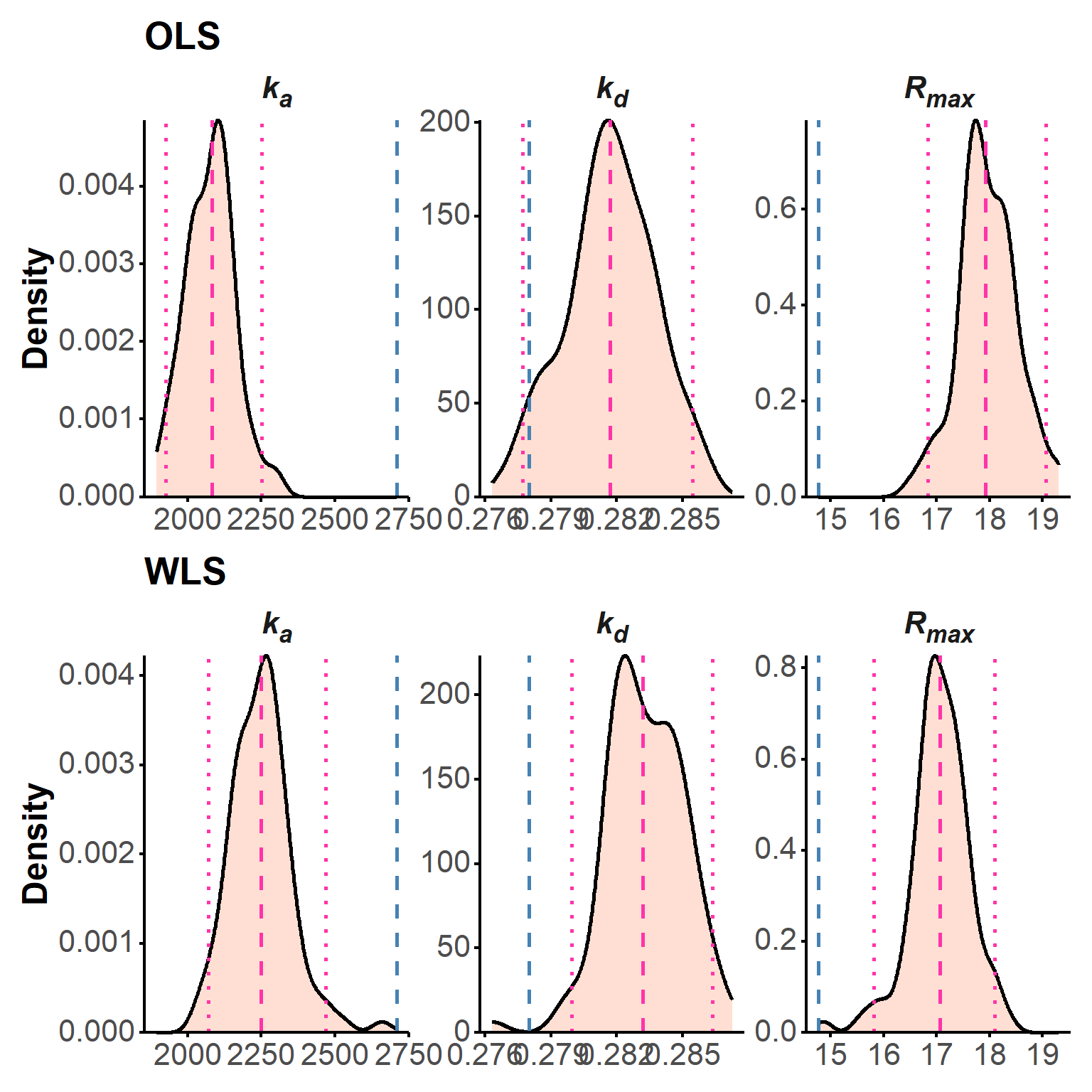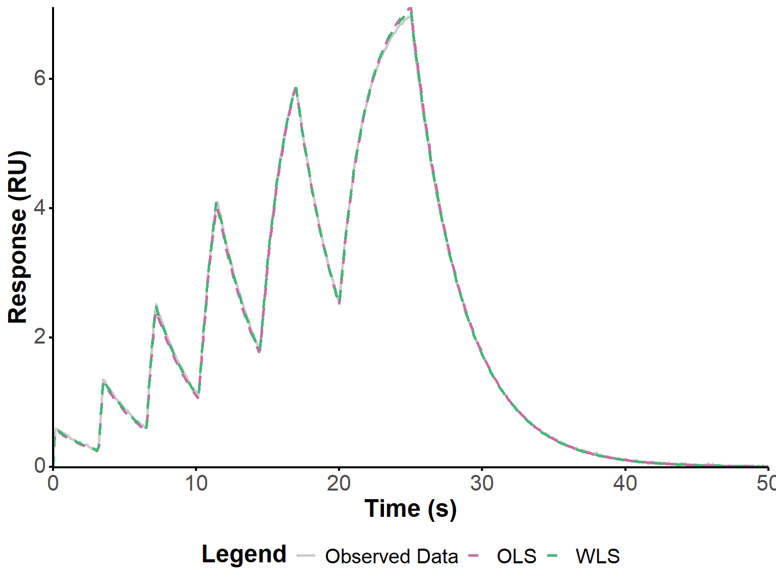 These refined estimates of the kinetic parameters were used to simulate the response, and compare it to the observed data for visual validation (Figure 4). The slight overestimation of \(R_{\text{max}}\) by OLS is visible but modest, and the fits are generally visually excellent.
