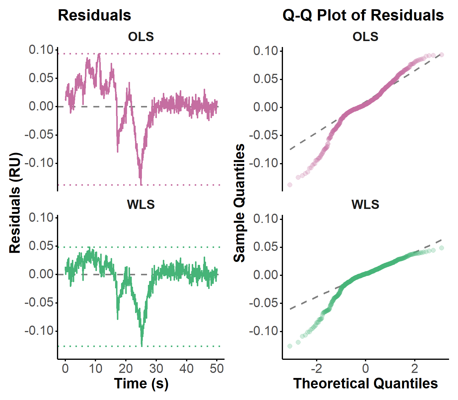 Q-Q plots can help to identify any deviations from normality, such as skewness or heavy tails, which could impact the validity of the parameter estimates and the confidence intervals derived from them. In particular, OLS optimizations assumes that the residuals are normally distributed. Here, the points in the OLS Q-Q plot deviate substantially from the dashed reference line, especially at both tails (lower and upper quantiles), suggesting that the residuals are not normally distributed. This may be due to the influence of RI during association phases. In contrast, the WLS Q-Q plot shows points that are much closer to the reference line, indicating that the residuals from the WLS fit are more normally distributed. There is still some deviation, particularly in the lower quantiles. Other approaches to opmitization could be explored to further improve the fit and the normality of the residuals, such as using more robust regression methods (e.g., Huber regression, Tukey’s bisquare). Generalized least squares (GLS) could also be considered to account for any heteroscedasticity in the residuals, by explicitely modeling their covariance structure.