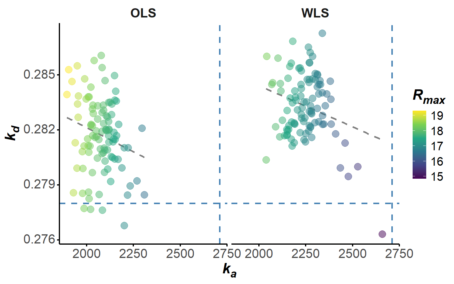 Additionally, we plotted the correlation between the bootstrap estimates of \(k_a\) and \(k_d\), colored by \(R_{\text{max}}\), to explore any potential relationships between the parameters across the bootstrap iterations (Figure 7). The somewhat linear relationship that is observed between \(k_a\), \(k_d\) and \(R_{\text{max}}\) across the OLS bootstrap iterations may indicate a trade-off between these parameters, which is important to consider when interpreting the results. This is much less the case with WLS.
